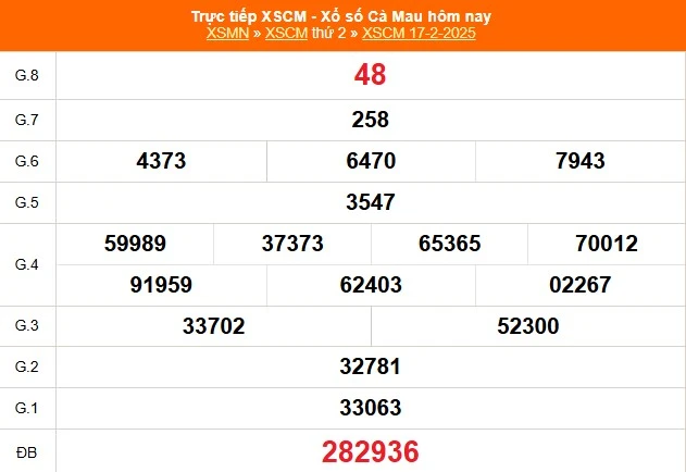 Chốt lô Đồng Nai đặc biệt ngày hôm nay 17/2/2025 như sau: